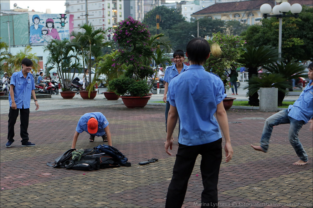 9. Далее следуют полтора часа покупок sim-карт. Пока девочки со всеми созвонились и прописали номера, начало темнеть. Мы зашли в соседний парк. А тут десятки пацанов в синих рубашках (аналоги наших белых воротничков?) рубились в мячик.