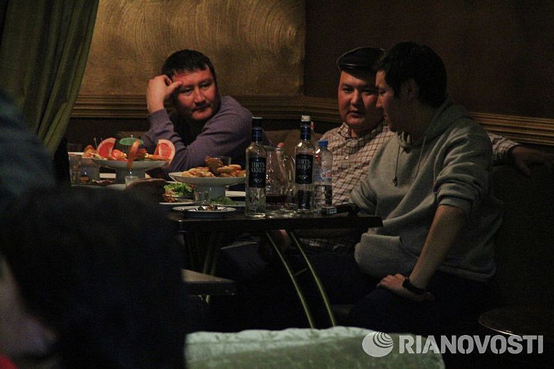 Громко звучит русская попса, водка льется рекой, клубится кальян — стиль отдыха гастарбайтеров далек от стереотипов, которые общественное мнение связывает со строгой мусульманской культурой. “Аллах дома остался”, — смеется 30-летний Замир. Он в России живет уже 10 лет, получил гражданство и даже устроился работать в полицию, однако своей родиной считает Кыргызстан. Официант славянской внешности, одетый в киргизскую национальную жилетку, приносит Замиру и его друзьям графинчик водки — она хорошо идет под манты.