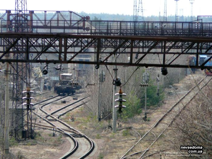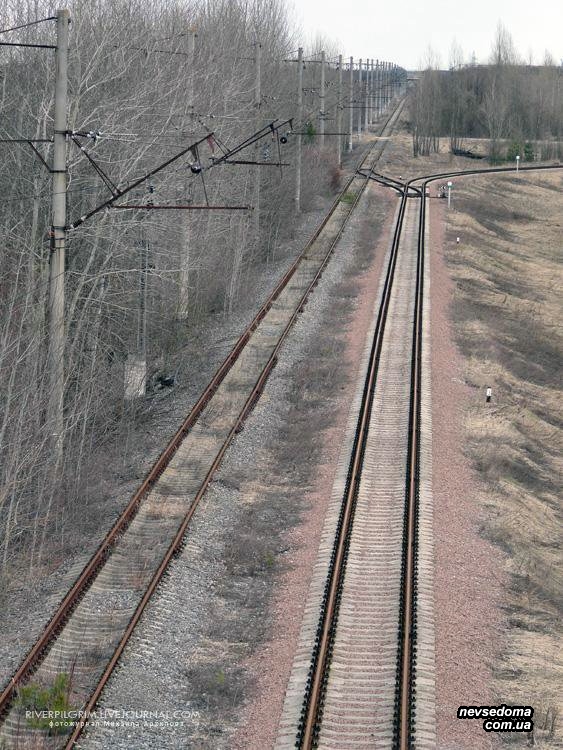 Железнодорожная линия справа ведет на территорию АЭС. По левым путям до аварии ходили обычные поезда дальнего следования, Чернигов-Житомир например, а также Москва-Хмельницкий, пассажирам которого 26 апреля 1986 года в обмен на билеты выдавали удостоверение "чернобыльца".