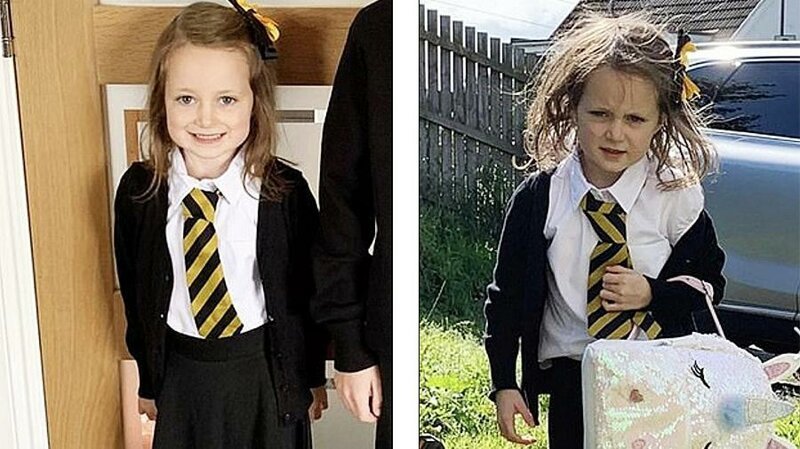 Настоящий ажиотаж во всемирной паутине вызвали фотоснимки Люси Фальконер, которая проживает в шотландском городе Глазго. Это фото, сделанные ее мамой в момент до и после первого визита девочки в школу. На первом фото девочка выглядела стильно и скромно. На ней была школьная форма, блестящие туфли, белую блузку украшал форменный галстук, волосы были красиво убраны.