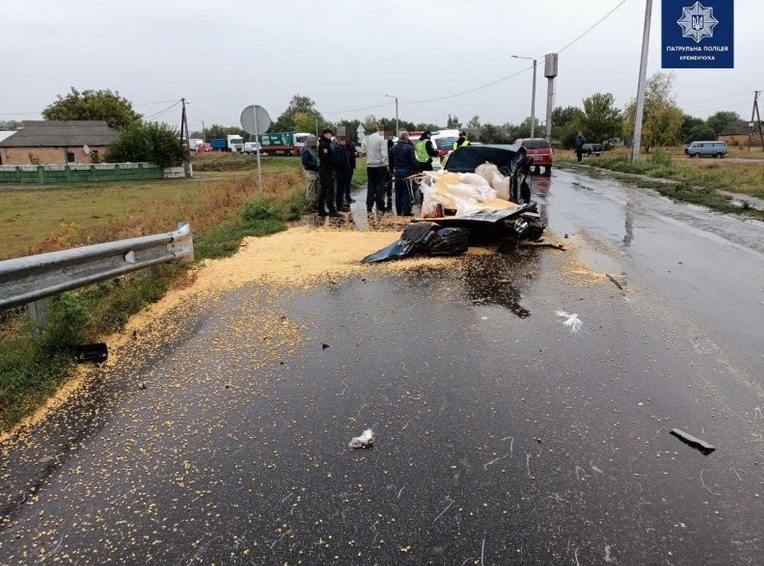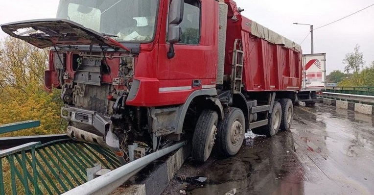 В Новосанжарском районе на автодороге «Полтава-Кременчуг», в селе Лелюховка водитель самосвала Mercedes не справился с управлением и чуть не вылетел с моста, попутно зацепив встречный пикап «ИЖ».