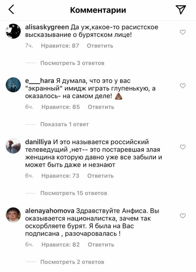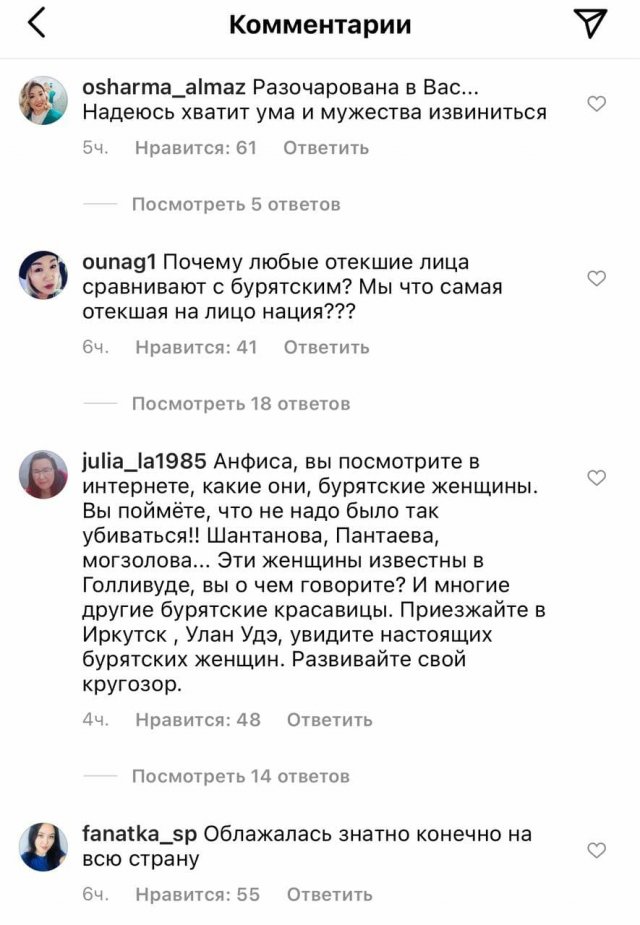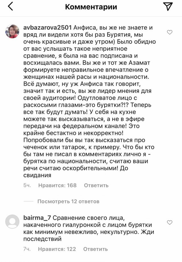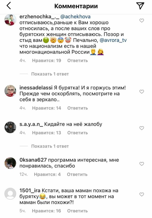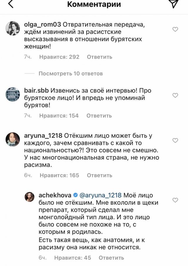 Популярная телеведущая Анфиса Чехова в эфире телеканала "Домашний" рассказала об уколах красоты, которые она делала несколько дней назад. По ее словам, после них лицо "отекло" и она стала похожа на "бурятскую женщину". Такое сравнение не понравилось представительницам народа и они атаковали ее соцсети, заставив извиняться.