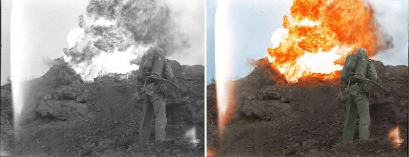 8. Морской пехотинец стреляет из огнемета во время битвы за Иводзиму, 1945 год