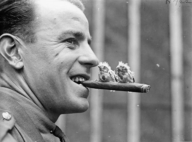 Британский офицер позирует с сигарой и канарейками, 1918 год