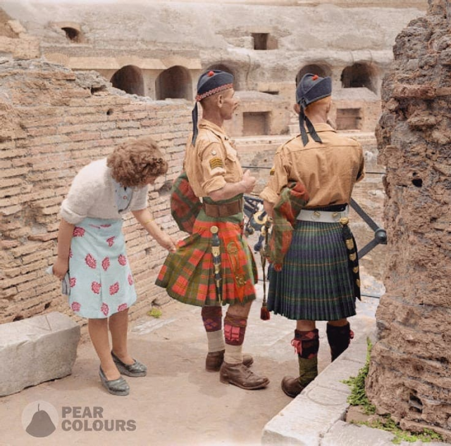 Любопытная итальянка разглядывает килты двух британских солдат после взятия Рима в июне 1944 года.