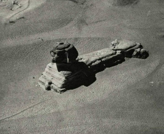 Сфинкс, фото которого сделано с воздушного шара в конце 19 века. На снимке видно, что сфинксом ещё не занялись археологи.