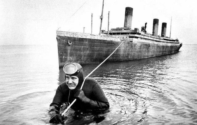 Профессиональный водолаз Кортни Браун буксирует 17-метровую масштабную модель на съемках фильма «Поднять Титаник», США, 1980 год.