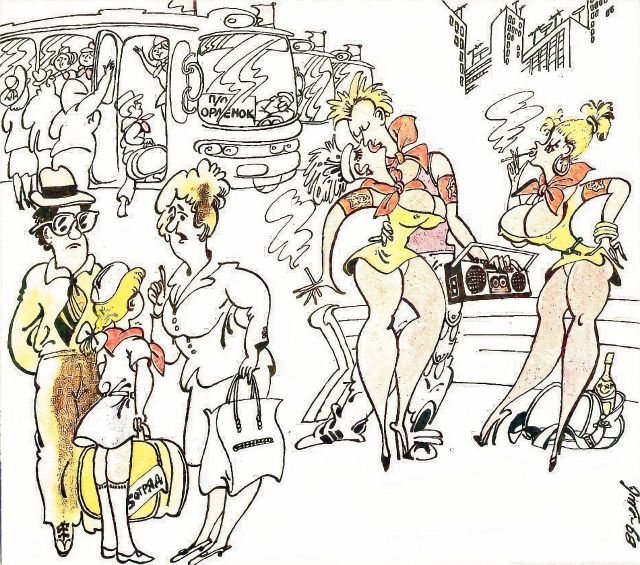 "Ты уж нас, дочь, не подведи, слушайся во всём вожатых!". Журнал "Крокодил", 1989 год.