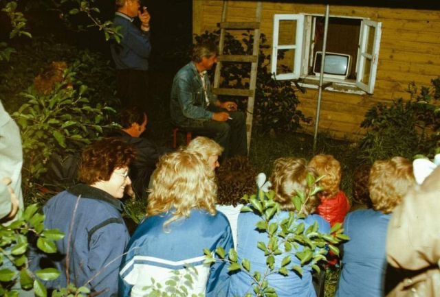 Люди ездили из Южной Эстонии в Таллинн и Северную Эстонию, чтобы посмотреть фильм. На снимке люди собрались посмотреть фильм в одном доме отдыха, серая трубка - это антена, используемая для просмотра финского телевидения