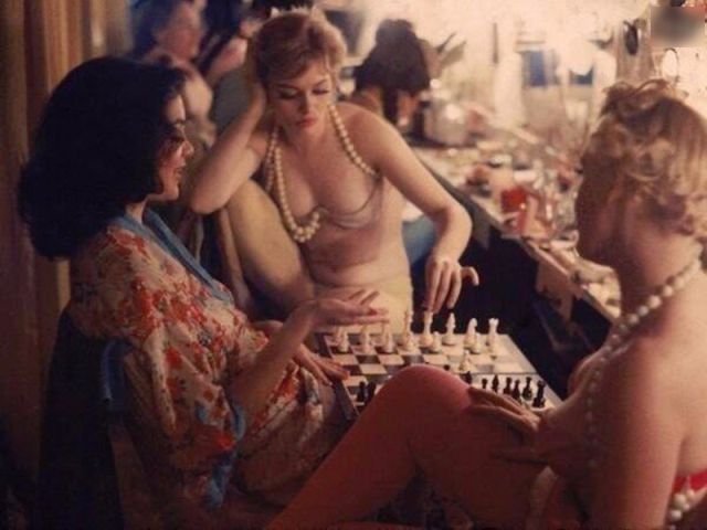 Нью-Йорк, 1958 год. Танцовщицы в ночном клубе играют в шахматы.
