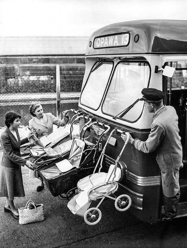Необычное место для колясок в передней части автобуса. Новая Зеландия, 1950 год.