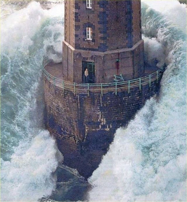 Волна в шторм накрывающая маяк у берегов Франции, 1980-е годы