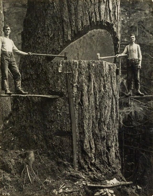 Два лесоруба и большое дерево, Тихоокеанский Северо-запад, 1915 год.