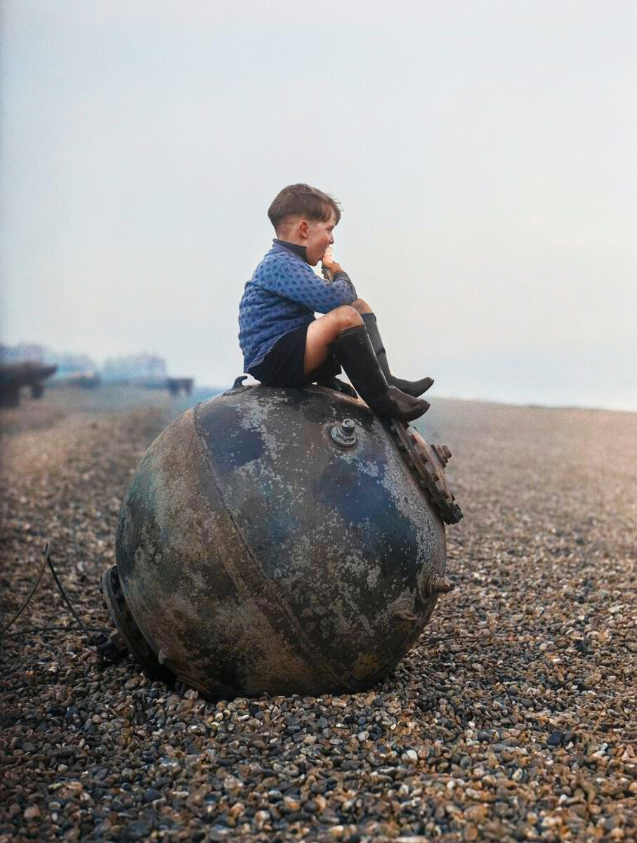 Мальчик кушает мороженое сидя на морской мине. Англия, 1945 год