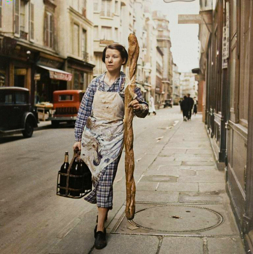 Женщина с бутылками вина и 1,5 метровым багетом. Париж, Франция, 1946 год