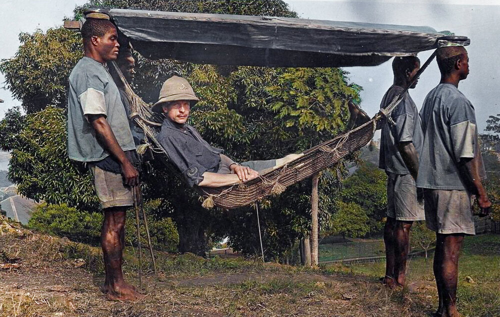 Офицер британской армии путешествует в гамаке, который на своих головах несут четверо туземцев. Сьерра-Леоне, 1920 год