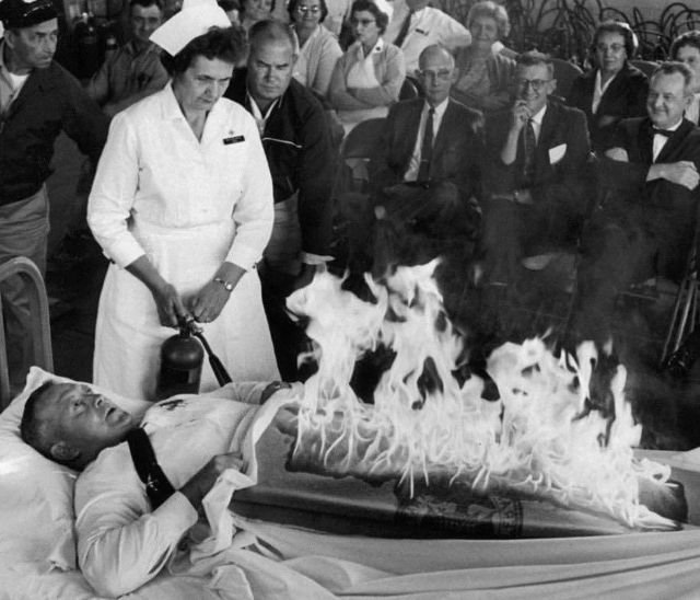 Haчальник службы охраны труда и техники безопасности Клиффорд Робертс выступает в качестве модели во время курса противопожарной подготовки для сотрудников больницы , Ричмонд, 1965 год.