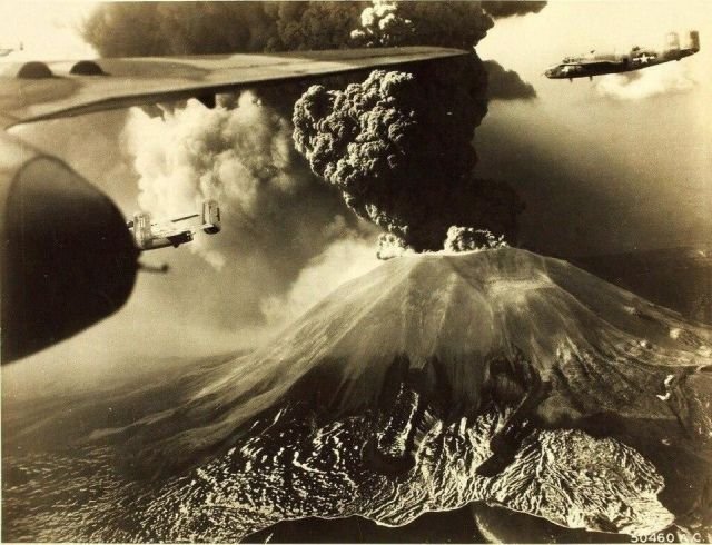 Американские бомбардировщики B-25 летят мимо извергающегося вулкана Везувий. Италия, март 1944 г.