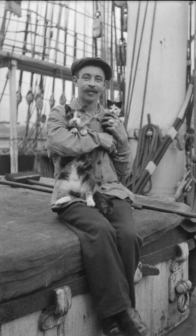 1910. США. Моряк фотографируется со своими кошками, которые всегда идут в плаванье вместе с ним