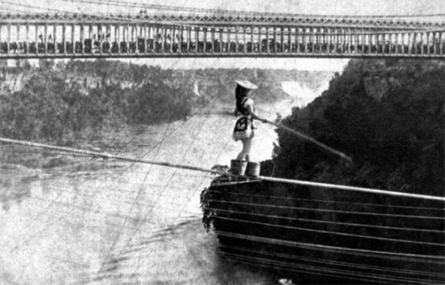 23 - летняя итальянская цирковая артистка Мария Спелтерина за 11 минут перешла по канату через Ниагарский водопад, затем за 10 минут вернулась обратно, двигаясь спиной вперед. 1876 год.