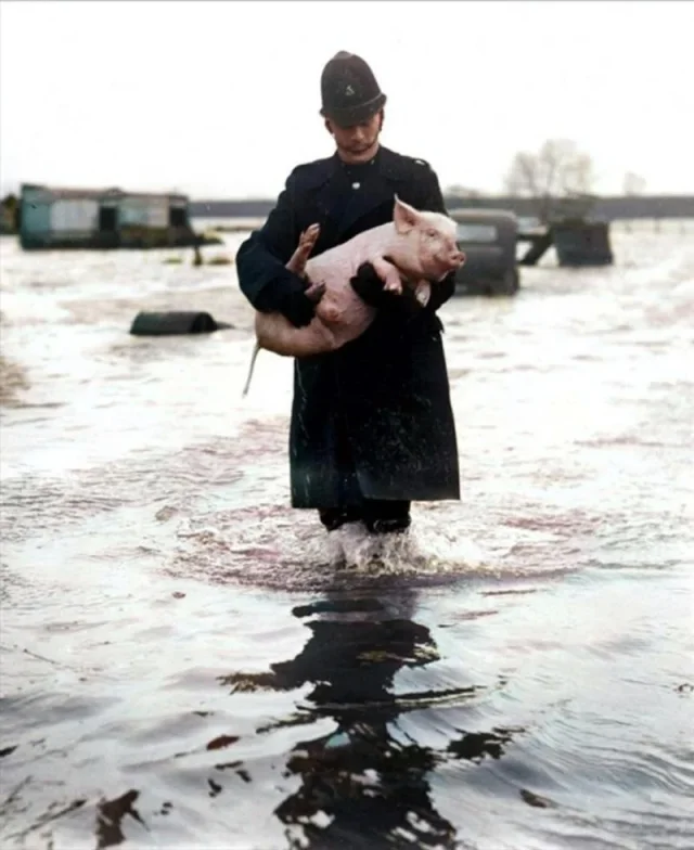 Полицейский спасает поросёнка во время наводнения в юго-восточной Англии, 1953 год.