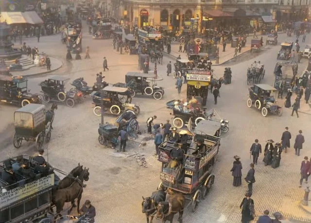 Моторно-гужевая «пробка», Пикадилли, Лондон, 1910 год ![]()