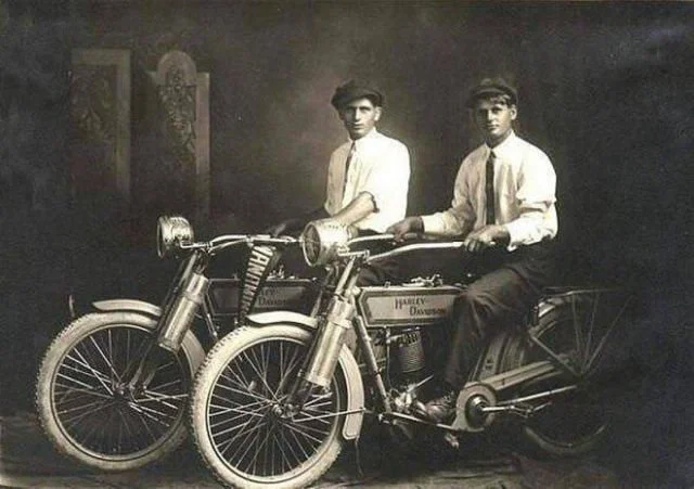 Уильям Харли и Артур Дэвидсон, создатели Harley Davidson, на своих байках в 1914 году.
