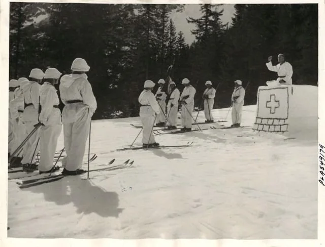 Падре ведет службу за кафедрой, сделанной из снега, для швейцарских военных лыжников. Швейцария, 1940 г.