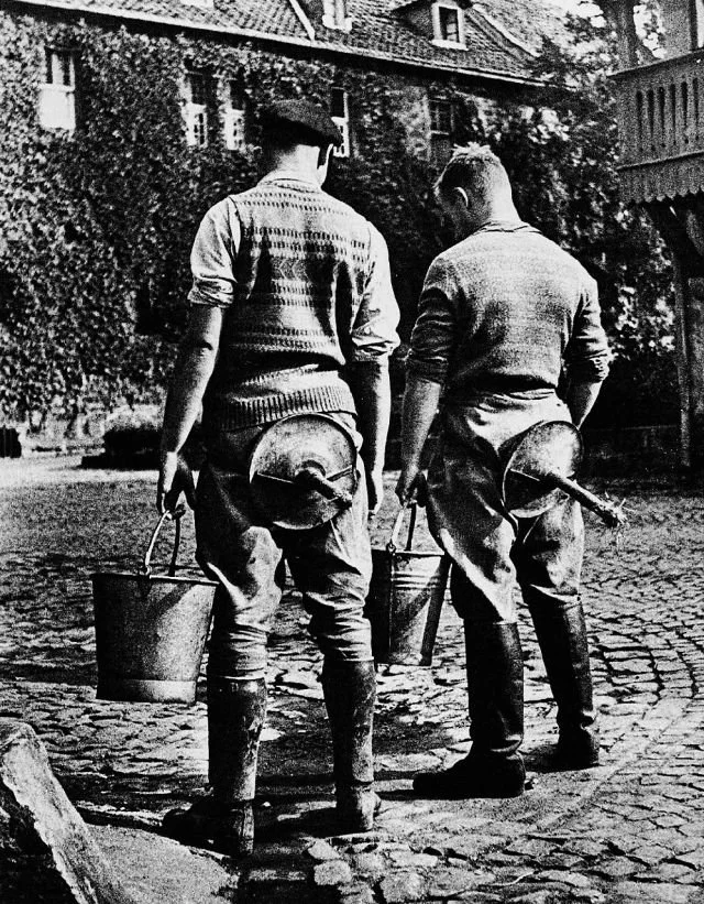 Студенты сельскохозяйственного института в Германии, 1934 год, учатся доить коров, используя специальные стулья.