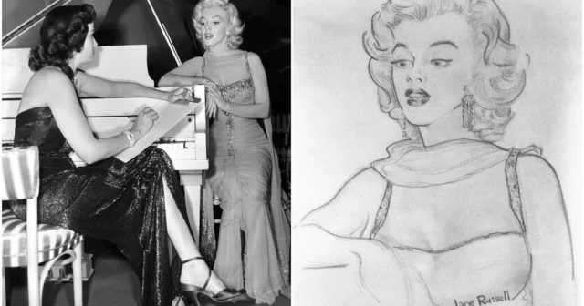 Актриса Джейн Рассел рисует портрет Мэрилин Монро в перерыве между съёмками фильма «Джентльмены предпочитают блондинок», 1953
