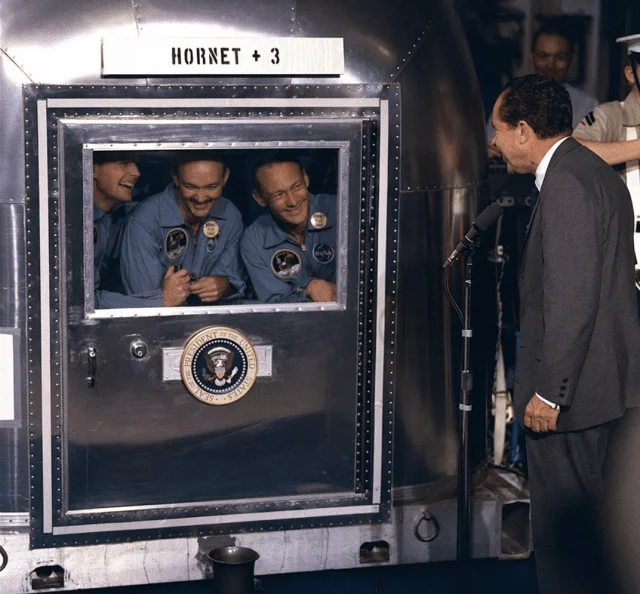 Ричард Никсон приветствует астронавтов «Аполлона-11» после их возвращения на Землю, 1969 год