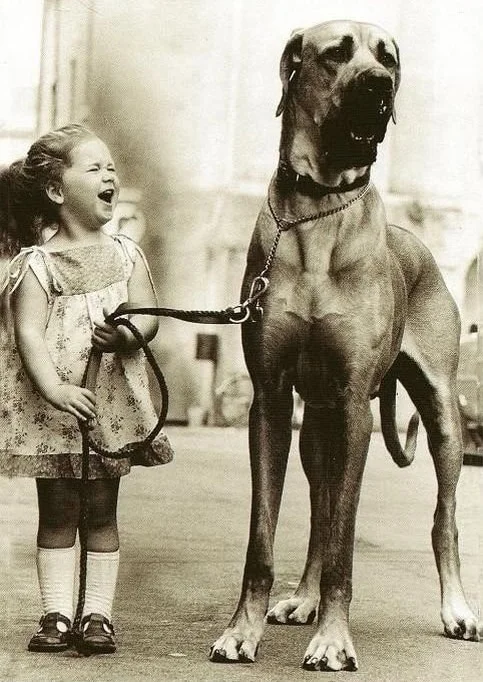 Невероятно счастливая девочка с невероятно огромной собакой, 1950-е годы