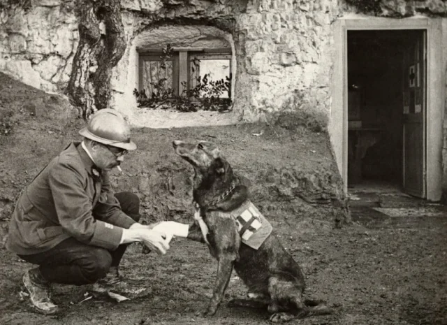 Солдат перевязывает лапу служебной собаке Красного Креста во Фландрии, Бельгия, 1917 год