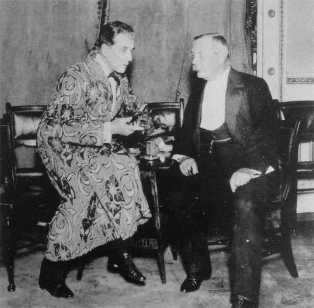 Артур Конан Дойл впервые встречается с Айли Норвудом, который исполнил роль Шерлока Холмса 47 раз в кино. 1922 год.