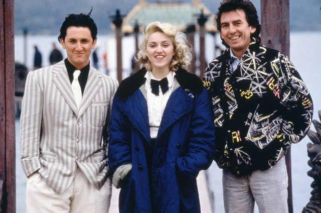 Актер Шон Пенн, его жена, певица Мадонна, и бывший битл Джордж Харрисон на съемках фильма "Шанхайский сюрприз", Гонконг, 1986 год.
