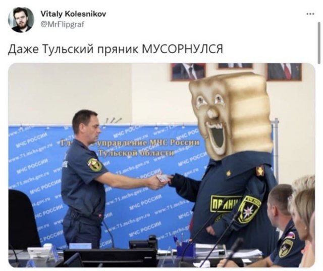 Шутки и мемы про нового сотрудника МЧС Тулы - "Тульский пряник" (10 фото) Категория: Приколы 19 августа 2021 Несколько дней назад в Туле появился необычный работник в МЧС - его назвали "Тульским пряником". Соцсети не могли обойти стороной внешность необычного сотрудника и пошутили на эту тему. +2 Тульский пряник, мемы, шутки, МЧС, Тула, фото