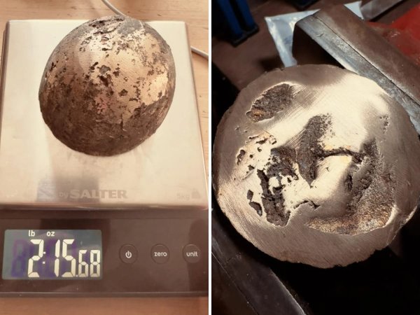 Я нашёл это, используя металлоискатель. Не магнитится, не искрит при шлифовке. Эта штука очень тяжёлая и прочная