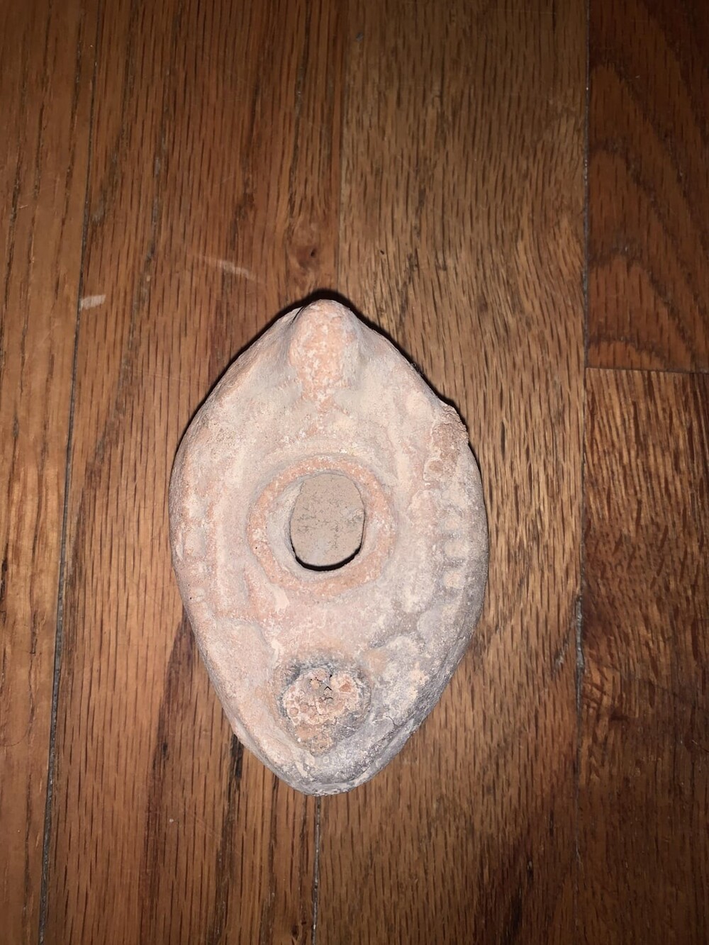 Это масляная лампа. Большое отверстие сверху - это то, куда наливают масло, а маленькое отверстие на конце удерживает фитиль.