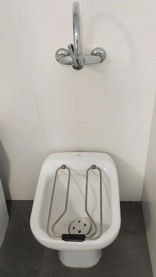 «Это похоже на биде, но больше по размеру. Находится в общественном туалете. У него есть металлические стержни, которые могут подниматься и опускаться. Наверху кран с горячей водой. Что это такое?»