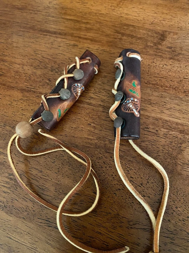 8. Кожаные цилиндры с металлическими крючками и узорами на шнуровке, обнаружились в сумке с украшениями