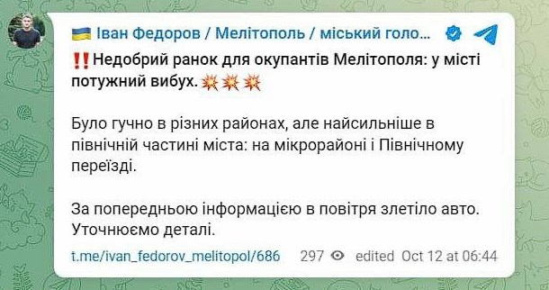 - Утро начинаем с приятного: в Мелитополе у оккупантов знатная бавовна. По предварительным данным подорвали авто или технику свинособак.