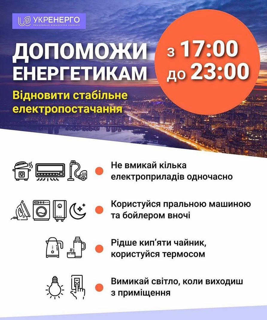 - Укрэнерго призывает украинцев экономить свет не только вечером, но и днем. Сегодня с 8 утра Украина потребляла на 6% больше энергии, чем вчера. Экономить призывают с 8 утра до 11:00, а далее с 17:00 до 23:00.