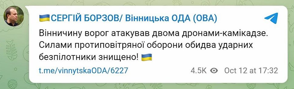 - Винницкую область русня атаковала двумя дронами-камикадзе. Оба были уничтожены, сообщает глава ОВА Сергей Борзов.