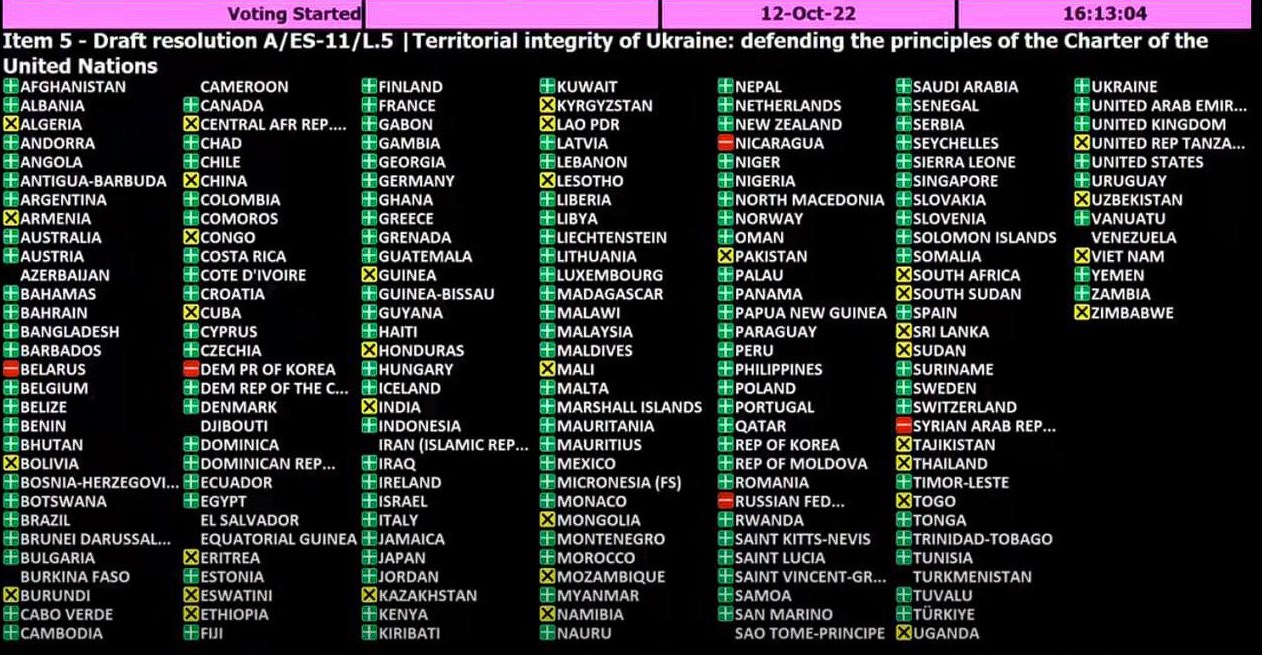 - Генассамблея ООН приняла проект резолюции осуждающей попытку рф аннексировать четыре украинских региона. 143 из 193 стран-членов проголосовали за резолюцию, 35 воздержались, 5 – проголосовали против.