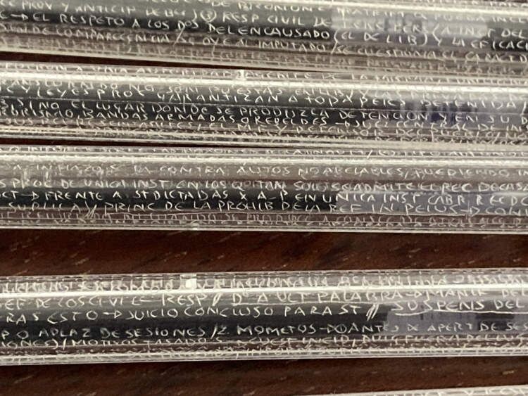 Иоланда, наводя порядок в ящиках стола, наткнулась на одиннадцать прозрачных шариковых ручек, вся поверхность которых была испещрена текстом. И рассказала, что эти ручки были конфискованы у одного из очень изобретательных студентов несколько лет назад. На них был аккуратно выгравирован Уголовно-процессуальный кодекс в кратком изложении.