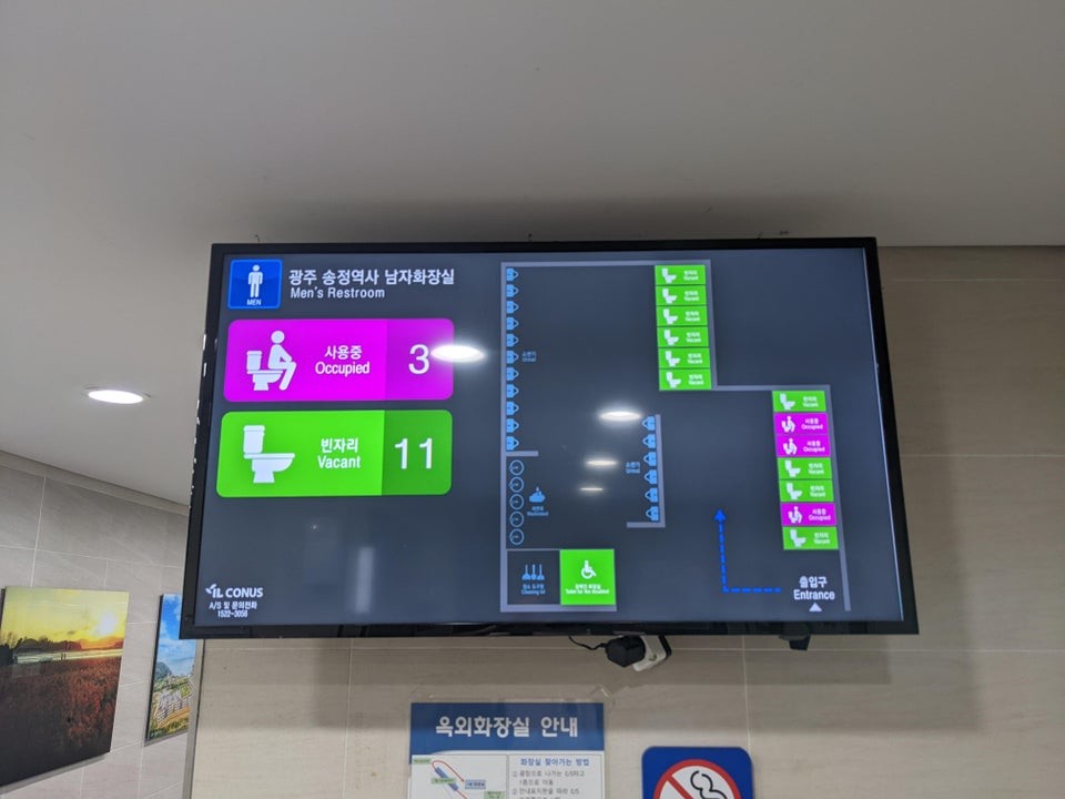 В Корее дисплей сообщает о том, какие туалетные кабинки используются, а какие пусты, поэтому не нужно вручную проверять каждую