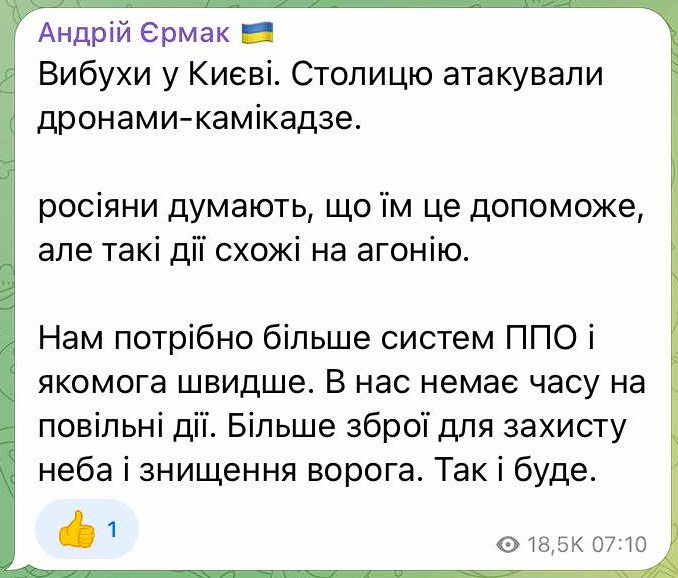 - «Такие действия похожи на агонию»: глава ОП Андрей Ермак отреагировал на атаку на Киев.