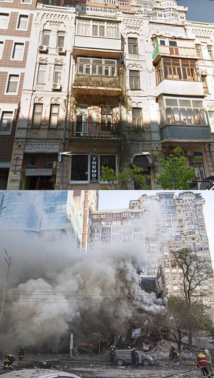 Жилой дом в центре Киева до и после российской атаки. А потом русаки называют нас террористами.