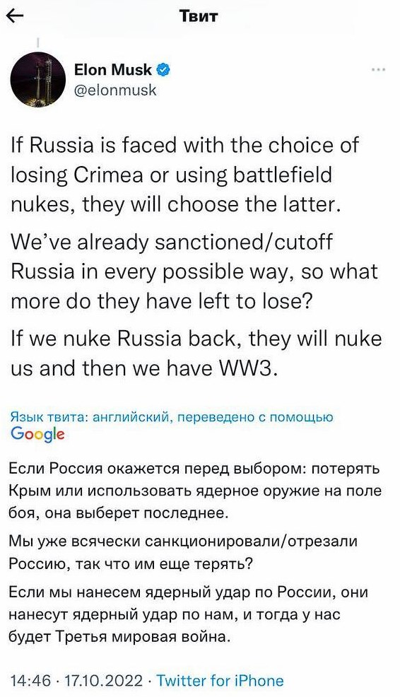 - Маск опять заговорил про ядерную войну.