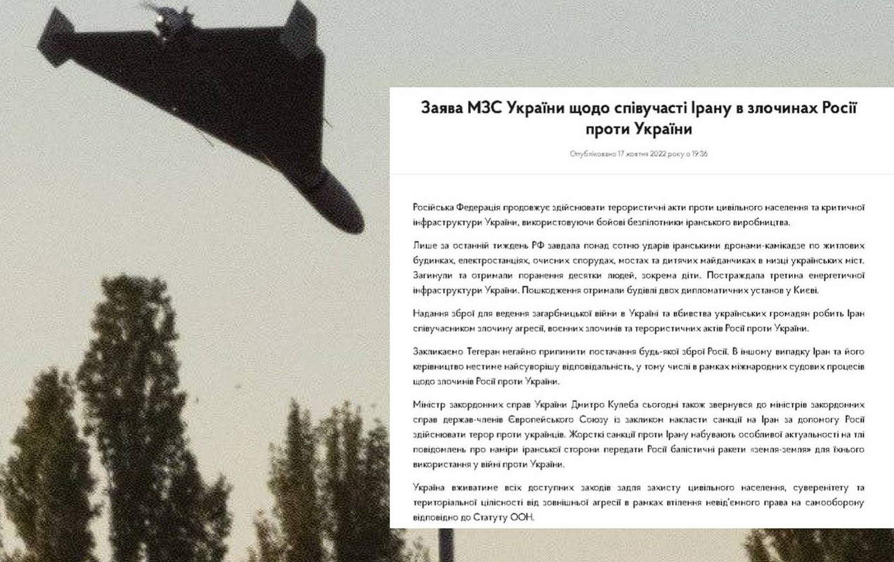 - Украина официально обвиняет (https://mfa.gov.ua/news/zayava-mzs-ukrayini-shchodo-spivuchasti-iranu-v-zlochinah-rosiyi-proti-ukrayini) Иран в соучастии в военных преступлениях рф. Официально Иран заявляет, что не поставляет рашке дроны.